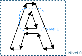 El 90 % de la información que recibimos es percibida a través del sentido de vista. En el caso de Infant este "sentido" también tendrá una gran importancia y por tanto, uno de los factores más importantes será el procesado y tratamiento de las imágenes que reciba. Para ello cada imagen o escena será tratada de modo que los bordes de los objetos serán vectorizados siguiendo el contorno de cada uno de ellos hasta cerrarlo o hasta que quede delimitado. Como un objeto puede tener más detalles en su interior este proceso se repetirá añadiendo niveles de vectores con lo que finalmente lo que Infant verá es el resultado de todo este proceso y será una serie de contornos (representando cada objeto de la escena) con sus respectivos detalles interiores en diferentes niveles de anidamiento (y en lo que he llamado el sistema de coordenadas de objeto pero eso será otro post :P). Un ejemplo más gráfico de esta idea es el que acompaña al post en el que los píxeles que componen los bordes de la letra A son transformados en una secuencia de vectores de diferentes niveles.