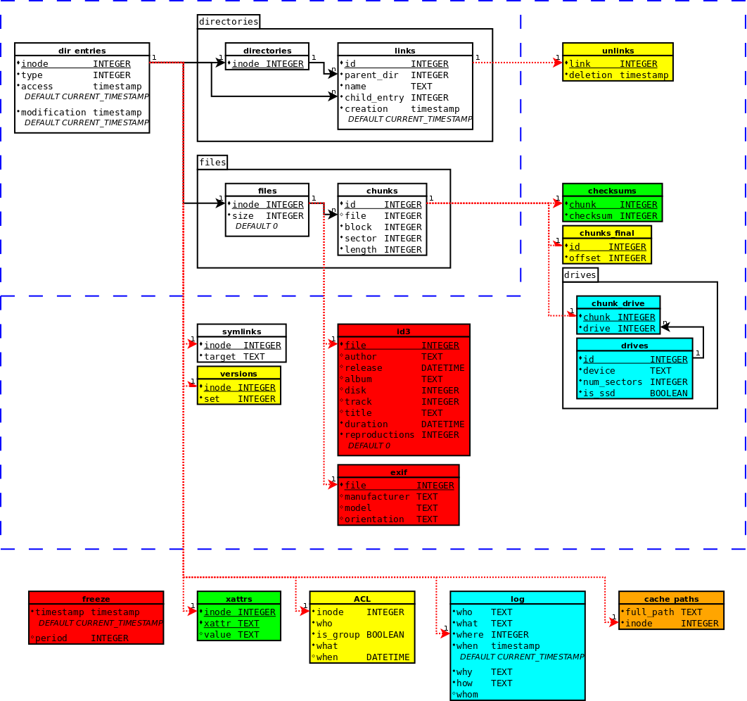 Como habréis podido ver hace días que no escribo por aquí y sin embargo en el svn ha habido muchos cambios... Esto es debido por un lado a que las modificaciones en el core para que acepte el lanzamiento de eventos para los plugins esta siendo mas complicado de lo que parecía debido a que hay que pensar en como aislar correctamente cada una de las partes (hasta ahora no tenia problemas, pero el plugin de checksums funciona a muy bajo nivel y además recibe eventos de distintas partes del código). Sin embargo estos replanteamientos están permitiendo una mayor independencia entre cada una de las partes y además me esta permitiendo el optimizar y documentar código bastante antiguo (en concreto estoy rompiéndome la cabeza para que DB.truncate utilice por debajo a DB.Split_Chunks), así que estoy matando tres pájaros de un tiro :-)Pero por otro lado también he estado aprovechando el tiempo, y el sistema de plugins ya esta bastante maduro. El sistema me ha quedado bastante escueto y portable, por lo que se podría utilizar en otros sistemas que precisen de un sistema de plugins, pero aunque ya haya otros sistemas de plugins para python (y algunos ya se me han adelantado en la idea de convertirlos en sistema "oficial") lo cierto es que no he visto ninguno que tenga algún mecanismo de control de dependencias entre plugins, y aunque creía que iba a ser mas complicado lo cierto es que al final ha sido casi obvio: al cargar el modulo obtenemos las clases de los plugins y vemos cuales son sus dependencias. Si no están todas disponibles dejamos el plugin pendiente, y si lo están entonces lo cargamos y comprobamos entre los pendientes si para alguno de ellos ha cambiado la situación. Simple, fácil y para toda la familia :-DEs por esto por lo que todavía no le estoy dando mucha popularidad al sistema ya que quiero tenerlo bien fino antes de abrirlo al publico (sobretodo por el tema de los plugins que se meten muy adentro del funcionamiento del sistema), pero probablemente para la versión 0.3 ya haga un llamamiento publico buscando ideas y colaboradores (y si, prometo que intentare poner al día y en la web cuales son los checkpoints para cada versión...). Sin embargo precisamente por esto he estado actualizando (y limpiando) el diagrama de la estructura de tablas mas acorde a como se esta perfilando el sistema ahora que empiezan a funcionar los plugins (mi idea era implementarlo después de la versión 1.0, pero con motivo del concurso y de la "participación de la comunidad" he tenido que cambiar las fechas para hacerlo mas accesible) y este es el resultado:(Los colorines son para indicar la dificultad de implementar cada uno de los modulos según cuanto haya que modificar el código: blanco=implementado, verde=directo o casi directo, amarillo=alguna modificación, naranja=reimplementación en parte, rojo=reimplementación de gran parte y turquesa=implementado pero necesita mejoras. Obviamente, con los checksums me equivoque...)Como podéis ver, arriba a la izquierda tenemos el core, ya implementado. He agrupado lo que correspondería al plugin de directorios y al de archivos porque aunque por el momento no tenga pensado implementarlos como modulos externos, lo cierto es que cada vez me esta tentando mas la idea (¡Mama mama, sin directorios! ¡Mama mama, sin archivos! ¡Mama mama, sin datos! X-D). Luego en el siguiente nivel tenemos los modulos de implementación que como dije anteriormente son dependientes de los elementos del core, y por ultimo tenemos los de valor añadido, en los cuales he puesto el ACL y el log (antes los tenia como de implementación) debido a que no son dependientes directos del core. También tengo aquí a un nuevo vecino en el barrio, xattrs (atributos extendidos), que aunque si es dependiente del core lo cierto es que no depende de sus claves únicas. Además, realmente voy a implementar los atributos extendidos para completar la funcionalidad del sistema de archivos y porque va a ser igual de sencillo que los symlinks (al igual que estos, se podría hacer con un mapeo directo de funciones) ya que a titulo personal, me parece una solución mucho mejor el usar algún tipo de estructura como las tablas id3 y exif, no un simple clave-valor que no da ninguna idea de cuales datos faltan por rellenar (lo admito, estoy obsesionado con los tags de los mp3s en el iTunes hasta el punto de que no solo relleno todos los campos de autor/album/disco/pista/titulo para tenerlos bien organizados sino que le meto dentro a los archivos todas las imágenes del album e incluso la letra de las canciones... :-P). Sin embargo también tengo que reconocer que aunque no son muy usados (al menos son unos completos desconocidos para el usuario medio, y para mi hasta hace poco), realmente pueden ser muy potentes y en un sistema de archivos "tradicional" puede ser usado para implementar un ACL y aumentar el nivel de seguridad, por ejemplo. En cualquier caso, para todo lo que se pueden usar los atributos extendidos un sistema dedicado puede cumplir su tarea mucho mejor, pero las estructuras en los sistemas de archivos tradicionales son demasiado fijas como para añadir este tipo de funcionalidades. Por eso la flexibilidad que ofrecen las bases de datos en estos casos es justo una de las razones que me impulsaron a usar una como base para diseñar el sistema de archivos.Pero este pequeño by-pass con replanteamiento de puntos de vista incluido también me esta permitiendo el tener tiempo para pensar sobre nuevos modulos, plugins y funciones que añadir al sistema, y parte del merito se lo tengo que dar a mi buena amiga Jennifer, una completa n00b para estas cosas (bastante que la conseguí sacar del lado oscuro y que empezara a usar Linux... :-P) pero que sin embargo su punto de vista como usuario raso me ha sido bastante útil (¡gracias! :-D ).Una de las ideas que me dio fue el implementar algún sistema de búsqueda avanzada en situaciones limite, del estilo "he buscado la foto del 