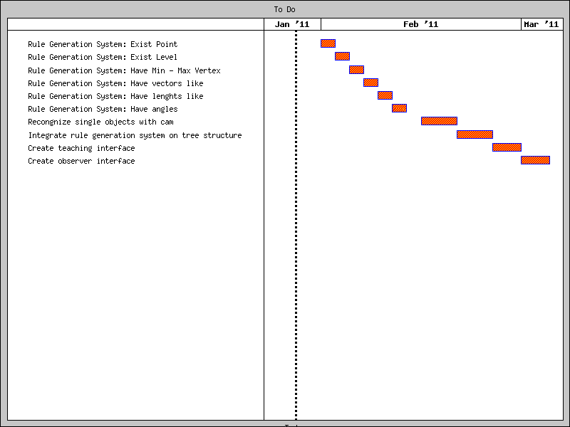 Después de un parón de casi un mes entre Navidades, trabajos inesperados, estudios y otras distracciones ya es hora de volver a ponerse en serio con Infant y para ello y por lo menos organizarme un poco he preparado la lista de tareas para el próximo mes:Id Tarea Descripción de la Tarea Fecha Inicio Fecha Final Porcentaje Completado 2278Rule Generation System: Exist Point2011-02-01 12:00 2011-02-03 12:000% 2279Rule Generation System: Exist Level2011-02-03 12:00 2011-02-05 12:000% 2280Rule Generation System: Have Min - Max Vertex2011-02-05 12:00 2011-02-07 12:000% 2281Rule Generation System: Have vectors like2011-02-07 12:00 2011-02-09 12:000% 2282Rule Generation System: Have lenghts like2011-02-09 12:00 2011-02-11 12:000% 2283Rule Generation System: Have angles2011-02-11 12:00 2011-02-13 12:000% 2205Recongnize single objects with cam2011-02-15 12:00 2011-02-20 12:000% 2204Integrate rule generation system on tree structure2011-02-20 12:00 2011-02-25 12:000% 2206Create teaching interface2011-02-25 11:00 2011-03-01 11:000% 2207Create observer interface2011-03-01 12:00 2011-03-05 12:000%Y como siempre en estos casos aunque os dejo el diagrama de gantt preparado por la forja en el que se ve algo mejor la evolucion del trabajo: